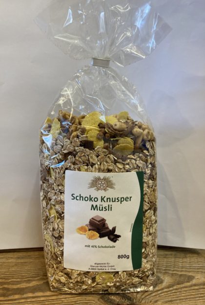 Müslimischung aus Haferflocken, Weizenflocken, Vollmilchschokolade, Roggenflocken, Cornflakes, Weizen gepufft, Reisextrudat, Zartbitterschokolade und Zucker