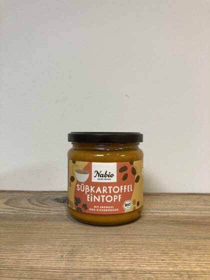 Wasser, Karotten* 14 %, Süßkartoffeln* 13 %, Kichererbsen* 8 %, ERDNUSSMUS* 6 %, Tomatenmark*, Zwiebeln*, Mais*, Kokosmilch* (Kokosnussextrakt*, Wasser), Steinsalz, Agavendicksaft*, Verdickungsmittel: Guarkernmehl*, Paprika* edelsüß, Ingwer*, Kreuzkümmel*, Petersilie*, Koriander*, Chili*